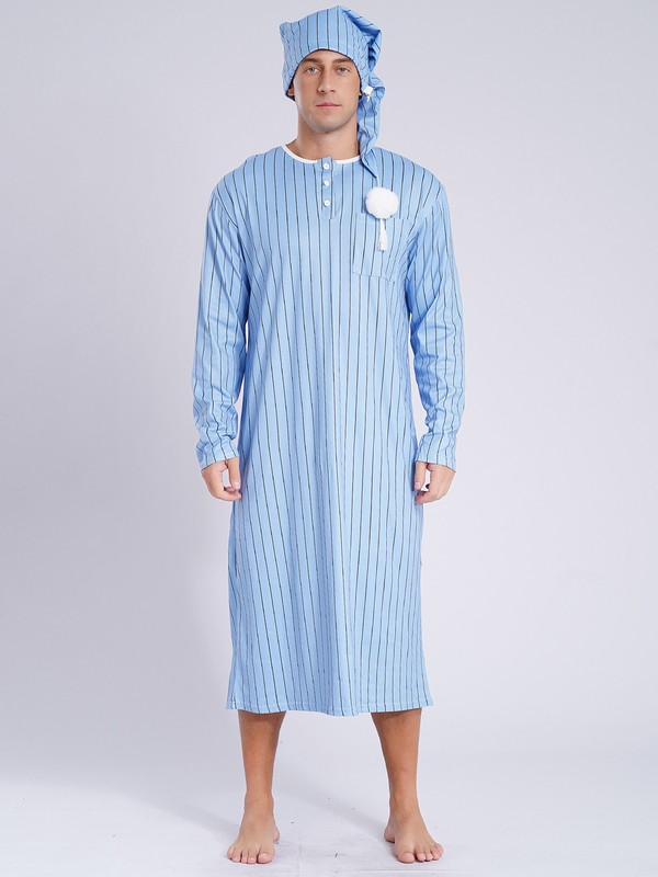 Men's Sissy Nightwear Loose Striped Robe Long Sleeve Nightshirt Cap Pajama Sets